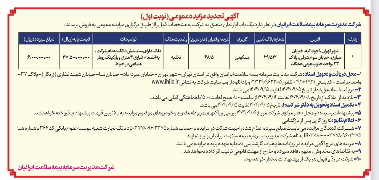 به گزارش روابط عمومی شرکت مدیریت سرمایه بیمه سلامت ایرانیان، بر اساس آگهی تجدید مزایده عمومی منتشر شده در روزنامه اطلاعات مورخ چهارشنبه ۵ آذر ۱۴۰۴، شرکت مدیریت سرمایه بیمه سلامت ایرانیان در نظر دارد نسبت به فروش یک باب آپارتمان متعلق به شرکت اقدام کند.